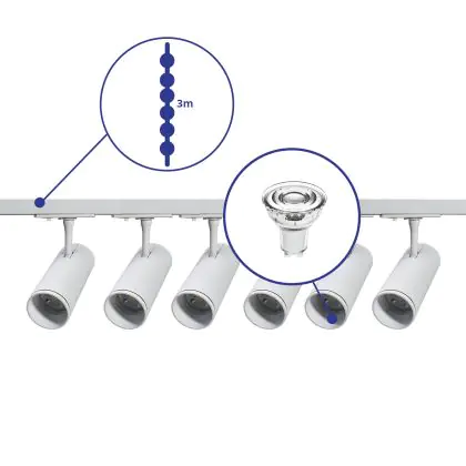 Complete Set 1-Phase Rail 3 Meter White | incl. 6x Spot + GU10 2700K 3W Dimmable + End Cap, Power Connector and I-Connector