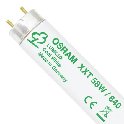 The Osram T8 L 58W/840 XXT G13 Cool White are energy efficiency class 'A' fluorescent tubes characterized by a 58W power output and provided with a G13 socket. These tubes measure 150cm in length. Their life span corresponds to 80.000 hours on average; this is a typical feature of the Osram Lumilux XXT line. Their color rendering is set between 80Ra to 89Ra. These fluorescent tubes produce a cold white light (their color temperature is 4000K).