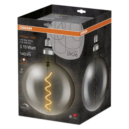 This Osram Vintage 1906 LED bulb is practical and stylish. It has the popular E27 (Edison screw) cap/base. It's globe shaped and has a transparent black finish that shows off the decorative LED filament inside. It's perfect for adding a cosy atmosphere to any environment and because it's dimmable, you've got ultimate control.